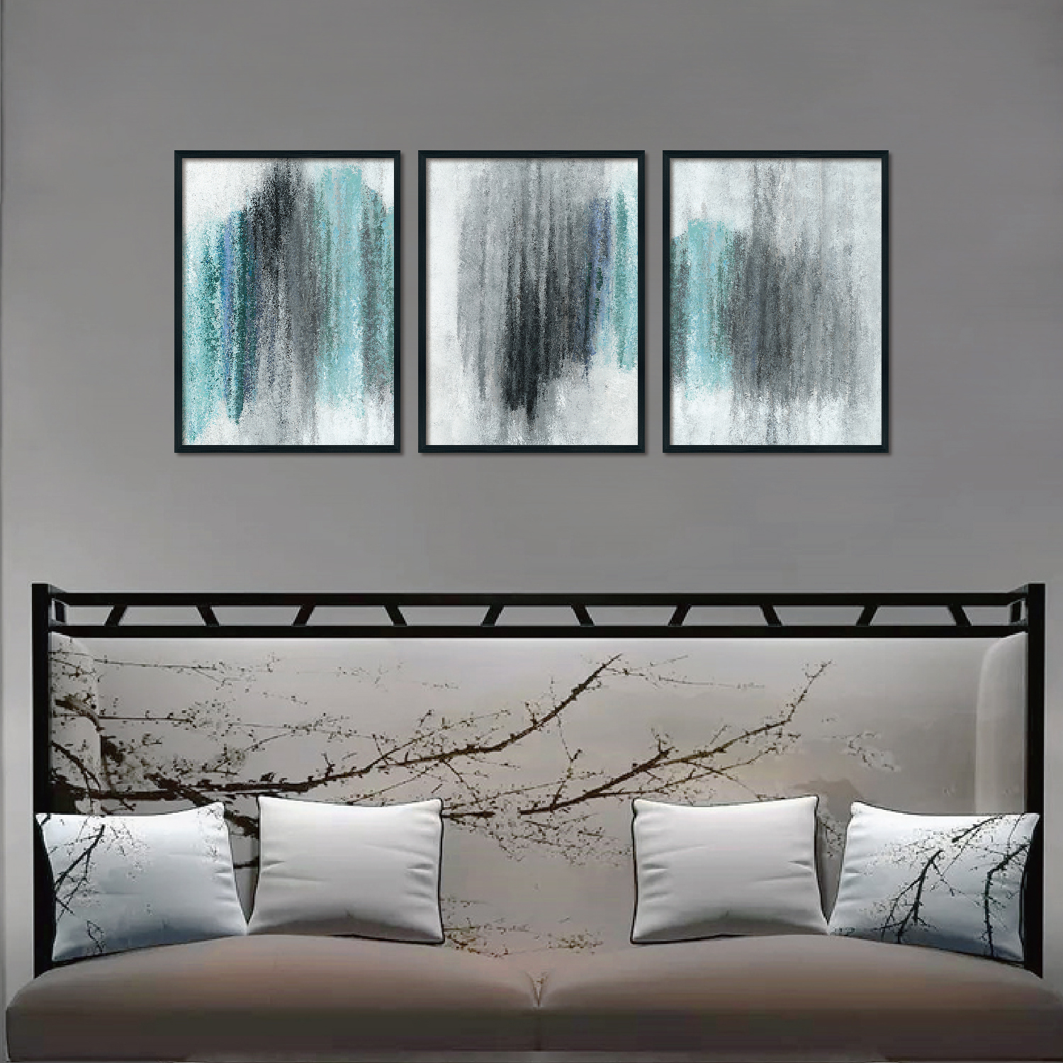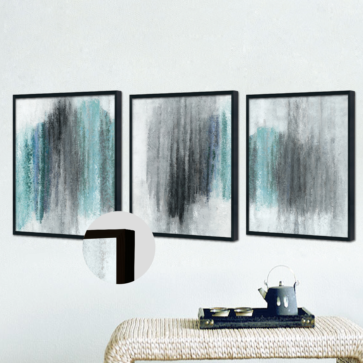 Triplet Wood Frame decorative painting (blue and black ink)